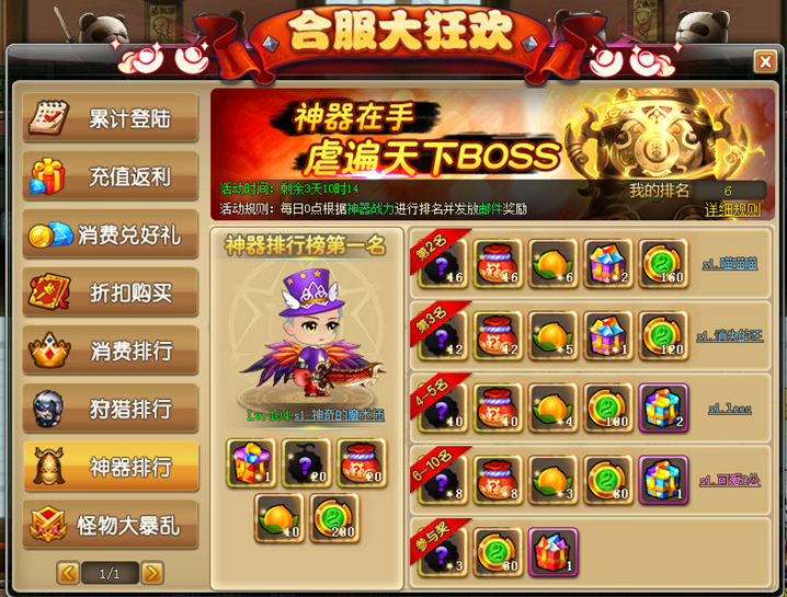 活动内容:每日0点根据神器战力进行排名并发放邮件奖励