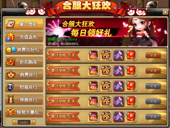 活动内容:合服后,累计登陆天数达到要求时,即可领取相应的登陆奖励。